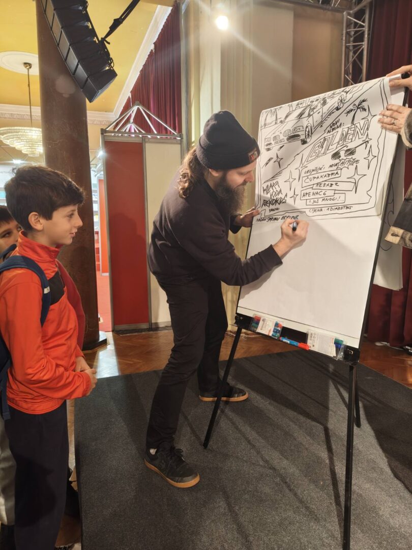 Posebno oduševljenje izazvao je završni dio susreta kada je gospodin Sarvan, na temelju asocijacija i naputaka koje su iznosili naši učenici, uživo i u svega nekoliko minuta izradio ilustraciju zamišljenog glazbenog albuma. Na veliko zadovoljstvo učenika, ilustrator je gotovu ilustraciju velikodušno poklonio školi kao uspomenu na ovaj susret.
