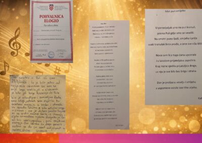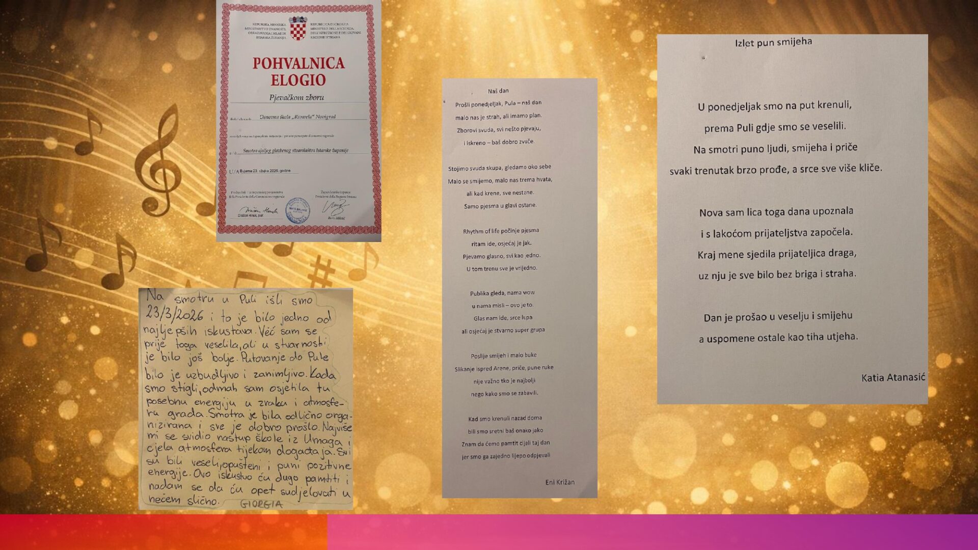 Školski zbor sudjelovao je na Smotri dječjeg glazbenog stvaralaštva osnovnih škola Istarske županije u Puli pod vodstvom učiteljice Nataše Blašković. Naše zborašice nisu skrivale zadovoljstvo i svoje su dojmove svele u nekoliko crtica vidljivih na posljednjoj slici.
